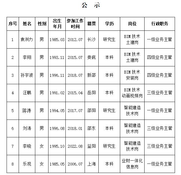 公司于2025年5月23日在公司官网对智能建造中心9名工作人员录用情况进行了公示,试岗期3个月,现8名同志试岗期考核通过、1名同志试岗期考核未通过。结合考核情况,根据公司相关规定,经公司党委研究,决定对袁洲力等考核通过的8名同志行政职务进行公示。